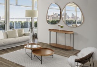 Mesa de Centro Debora Redonda produzida em chapa de MDF no tampo/estrutura e laterais revestida com madeira Sumauma, pintura a mão.