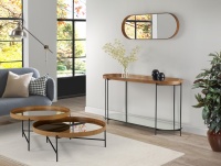 Mesa de Centro Debora Redonda produzida em chapa de MDF no tampo/estrutura e laterais revestida com madeira Sumauma, pintura a mão.